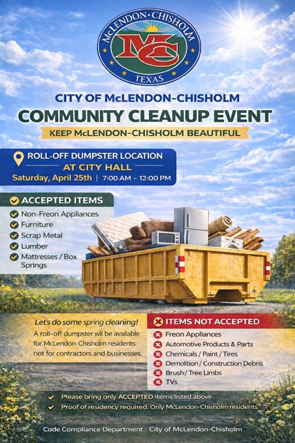The City of McLendon-Chisholm, in partnership with Community Waste Disposal (CWD), is pleased to announce the 6th Annual Spring Cleanup Campaign, which will be held on Saturday, April 25, 2026 – 7:00 am to 12:00 pm, at City Hall. This event provides an excellent opportunity for residents to participate in seasonal cleaning efforts by properly disposing of unwanted [accepted] items in a safe and convenient manner. The City remains committed to supporting a clean and well-maintained community, and this campaign is one of the many ways we strive to serve our residents.
